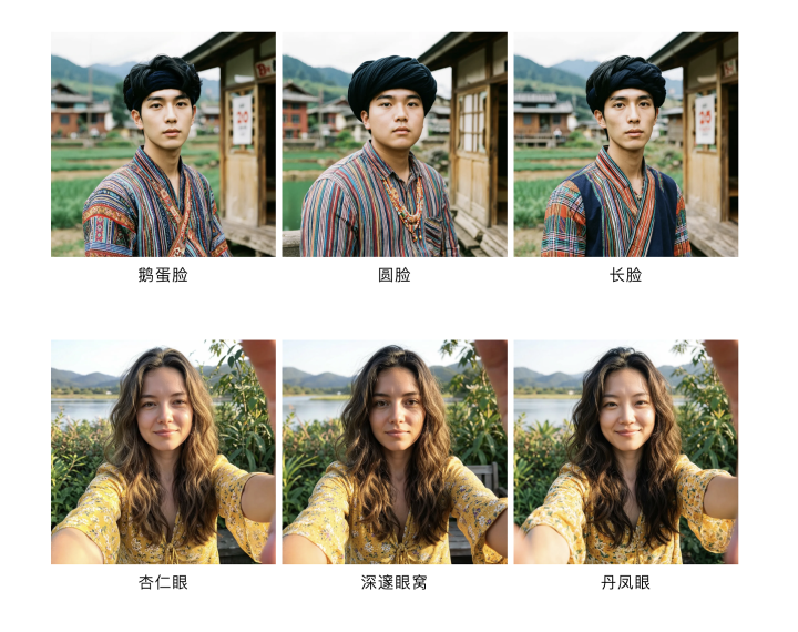 Wan2.7-Image强化了虚构形象抓脸功能,辅助从骨相、眼眸到五官细微处的全方向定制,比如更换指示词中的脸型(鹅蛋脸、圆脸、方脸、长方脸等)、眼部特征(杏仁眼、高深眼窝、圆眼、丹凤眼等),BSports罢了“千东谈主千面”。