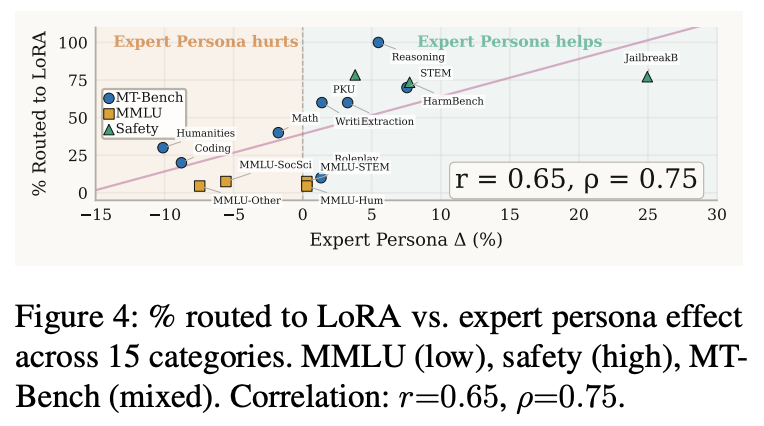 图4:在Qwen2.5-7B-Instruct模子上,门控收集将查询路由至LoRA的比例与各样别在众人变装影响下的推崇之间的关系