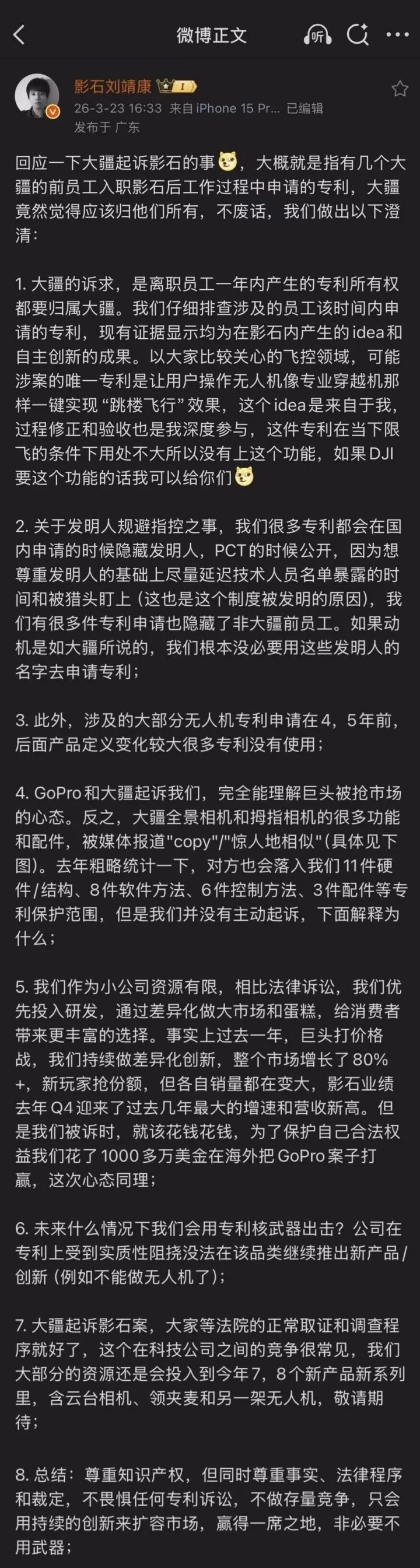 影石创举东说念主刘靖康在立案当天马上通过微博回话,解释此举是为了“尽量延长工夫东说念主员名单露馅的时候和被猎头盯上”。他强调,影石已“仔细排查波及的职工该时候内苦求的专利,现存笔据高傲均为在影石内产生的idea和自主立异的效用”。