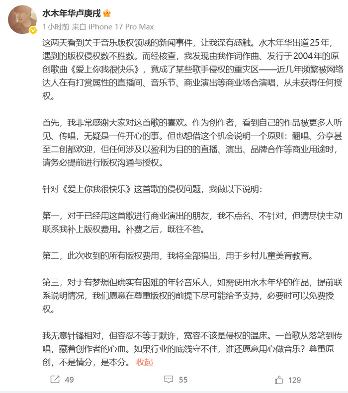 卢庚戌示意,“水木年华出说念25年,遭遇的版权侵权擢发可数。而经核查,我发现由我作词作曲、刊行于2004年的原创歌曲《爱上你我很欢腾》,竟成了某些歌手侵权的重灾地——近几年时时被汇聚达东说念主在有打赏属性的直播间、音乐节、买卖上演等买卖地点演唱,从未获取任何授权。”