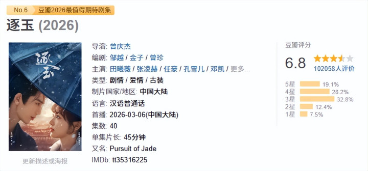 该剧豆瓣评分仅6.8,抛开差评不谈,不雅众给出的好评事理,险些全是对导演镜头好意思学以及演员颜值的咋舌。