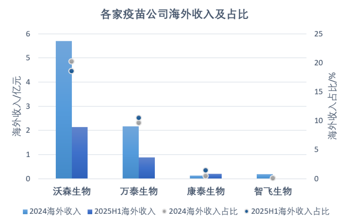 据沃森生物2025年中报,当今公司产物已累计出口24个国度和地区,累计出口数目超6300万剂。2024年和2025年上半年,沃森生物国际营收分别为5.70亿元、2.14亿元,约占总营收的20%,在完全值和占比上远高于同业。另据2025年功绩预报,公司当期出口疫苗产物收入同比增长约35%。