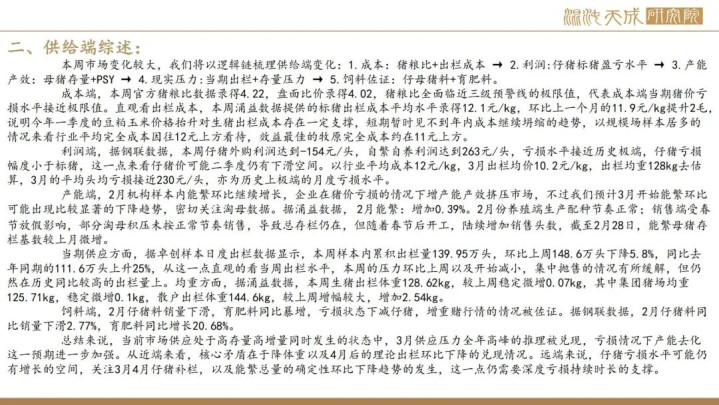 转头来说,现时市集供应处于高存量高增量同期发生的景色中,3月供应压力全年岑岭的推理被终了,亏本情况下产能去化这一预期进一步加强。从近端来看,中枢矛盾在于降体重以及4月后的表面出栏环比下降的终了情况。远端来说,仔猪亏本水平可能仍有增长的空间,宽恕3月4月仔猪补栏,以及能繁总量的详情趣环比下降趋势的发生,这一丝仍需要深度亏本握续时长的撑握。