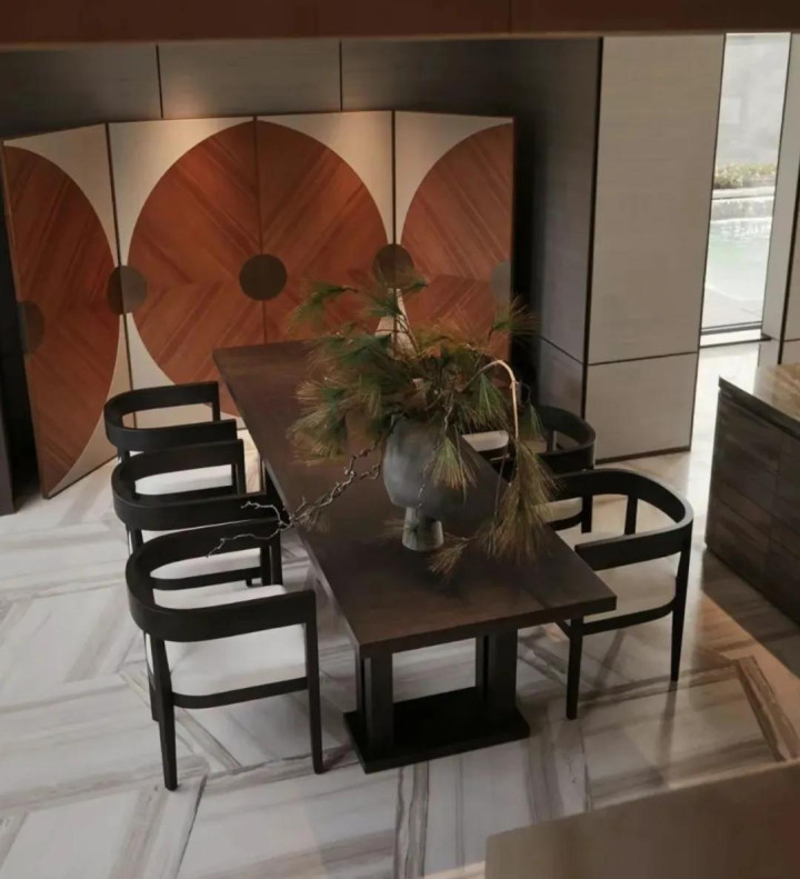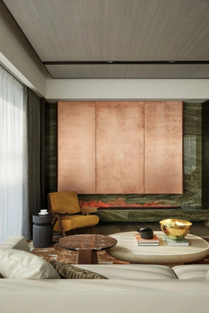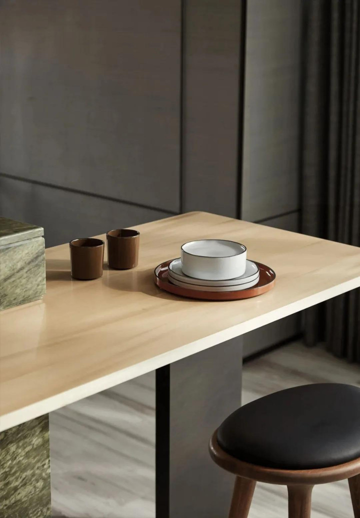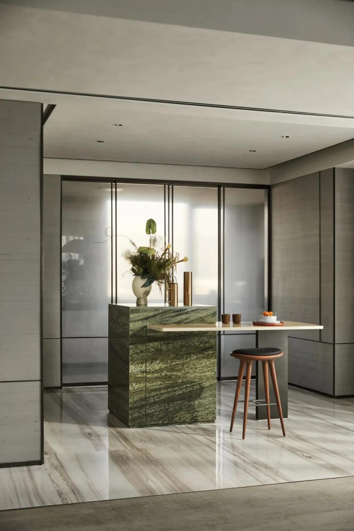 乌绿色理石与黄铜布景板造成对比关连,在材质与光泽之间建立脉络,使空间兼具当然气味与维捏特色。西厨经受隐形貌镶嵌盘算,将收纳整合进界面之中,中央吧台作为功能中枢,在金属质感的烘托下种植实用性与夙昔参与度。