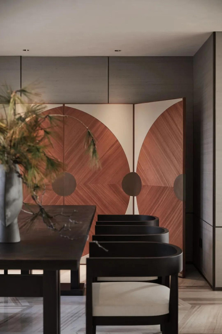 The background wall functions as a transitional surface, softening the conventional role of partitioning. Through the use of negative space, it guides visual flow toward adjacent functional areas, enhancing continuity and spatial depth.