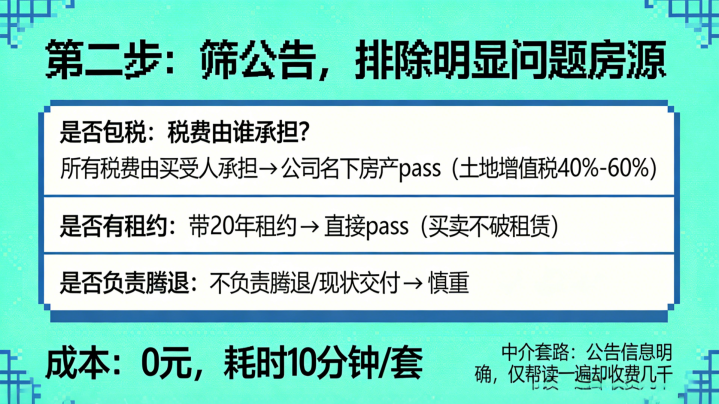 第二步:筛公告,舍弃彰着问题房源(本钱:0元,耗时10分钟/套)