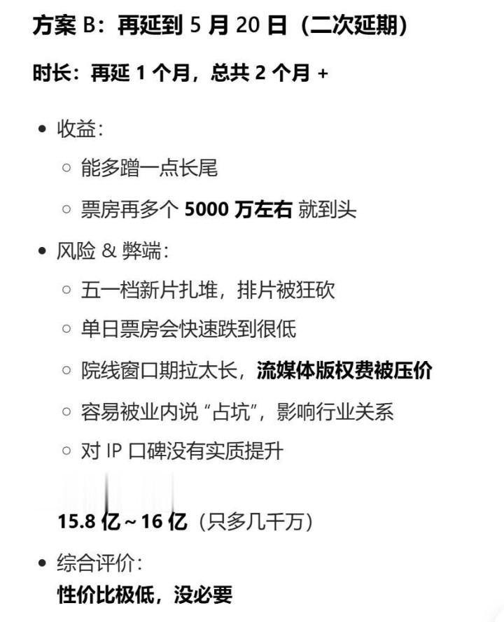 AI以为《镖东说念主》必须延期B体育,但延期到4月16日是最好采选,延期到吴京说的5月20日有可能冲更高票房但风险飞腾,总票房落点在15.8亿到16亿之间,性价比不高。